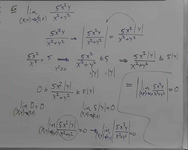 Jag fattar alltså inte vad absolutbeloppet |f(x,y)| har med det ursprungliga gränsvärdet för f(x,y) att göra. Varför räcker det att visa att |f(x,y)| → 0? Vilken regel eller sats använder man där?