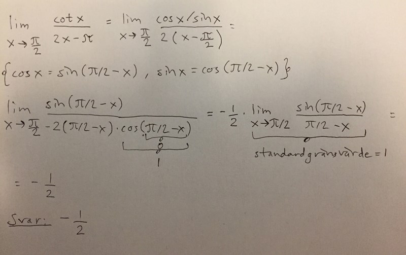jag har försökt sätta t=x-pi/2 för att då går t mot 0 och pi i nämnaren försvinner, men jag kommer ingenstans.