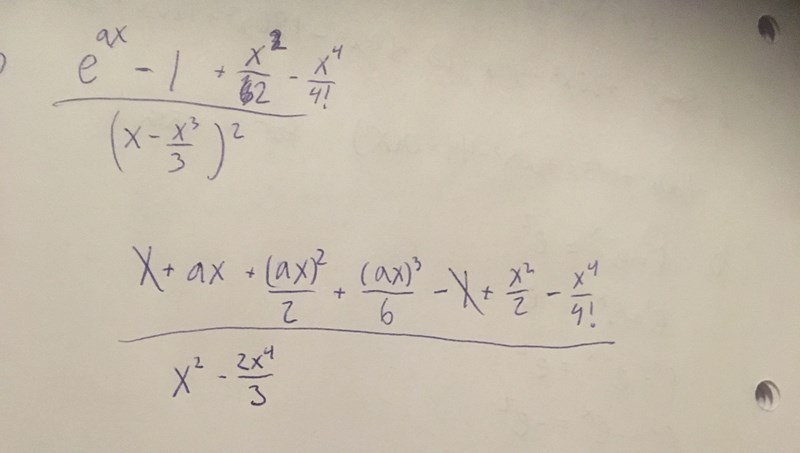 Några saker: borde det inte finnas en +x^6 / 9 term i nämnaren? Och när du taylorutvecklar cosinus i täljaren så ser du ut att ha missat att det står cos(sqrt(x))