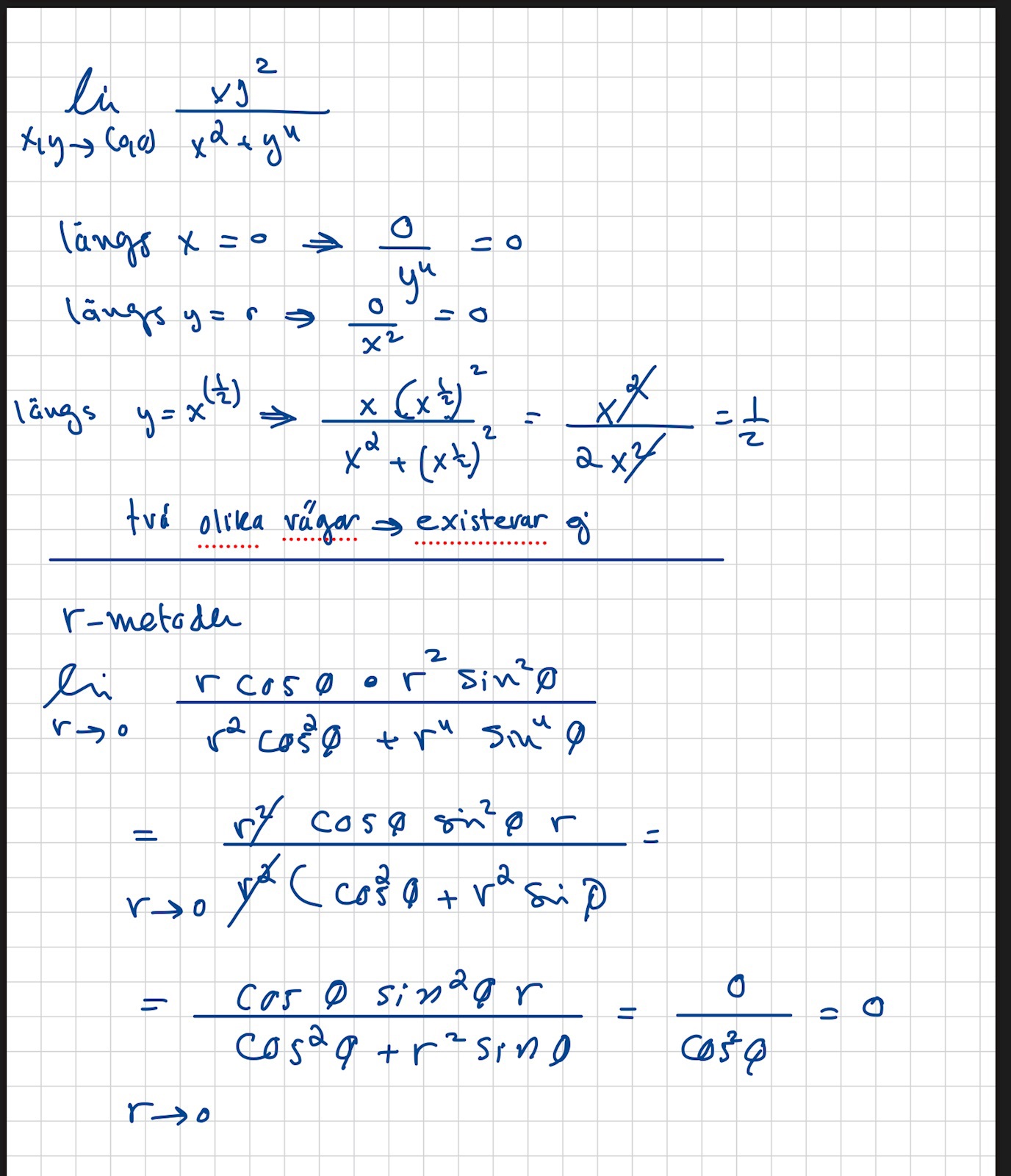 försökte att jobba gränsvärdet och då fick jag att det inte existerar om man använder path metoden. Dock visar r-metoden att det är lika med 0.