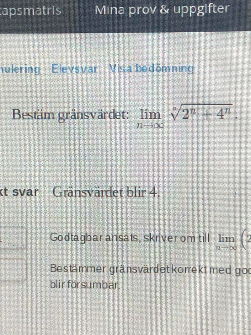 Det första jag tänker att man kan göra är att skriva om 4^n till en bas med 2. Men kanske tänker fel. Jag tänkte även att man kunde skriva n roten ur som (2^n +4^n) ^1/n