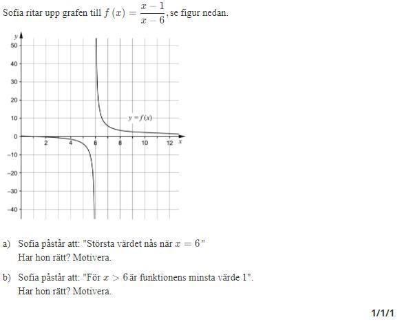 När x går mot ett mycket stort tal så närmar sig funktionen värdet 1, men blir aldrig 1. Därför har Sofia fel när hon säger att funktionens värde blir 1.