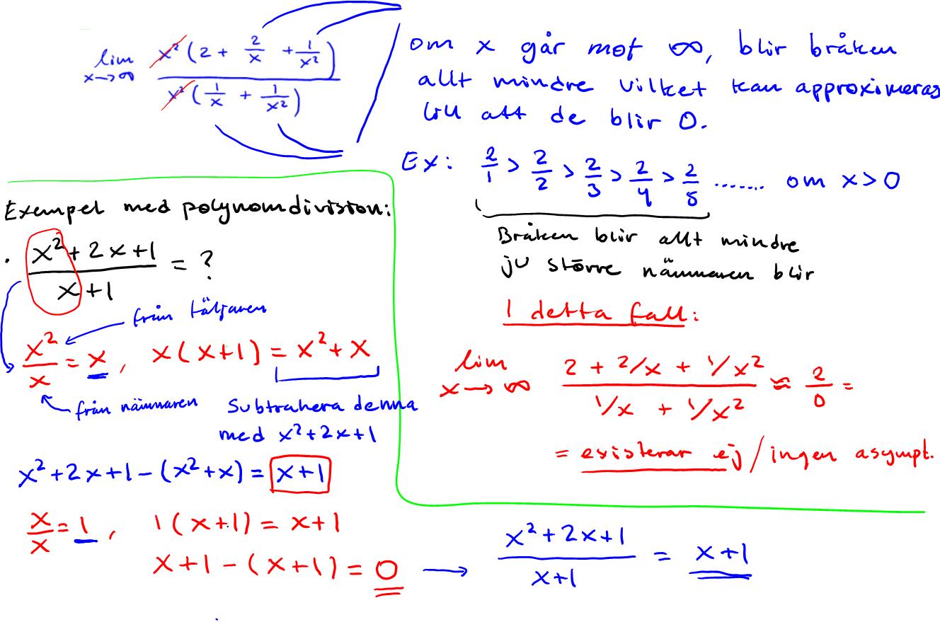 offan123 skrev:Horisontella delen vet jag inte hur man gör när x går mot oändligheten. x i kvadrat kan man stryka bort. Det i nämnaren går båda kvoter mot noll. Men sen om jag tittar i täljaren så ger den andra kvoten 0 och likaså för den tredje kvoten. Blir svaret då 2?