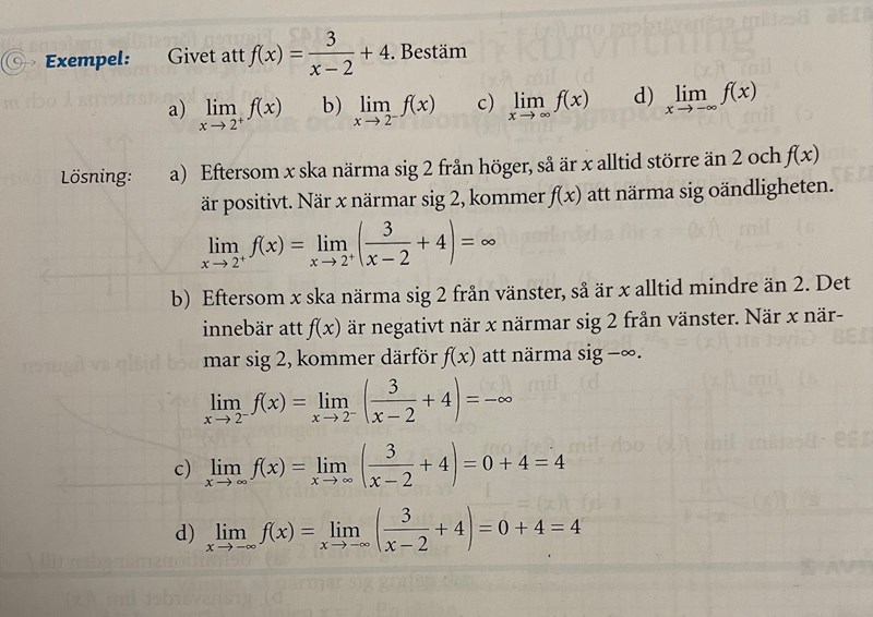 Okej. Ska man i c och d tänka att hela kvoten (3/(x-2)) går mot oändligheten eller mot noll? För kvoten försvinner ju och kvar blir det enbart 4. Hur ska man resonera där?