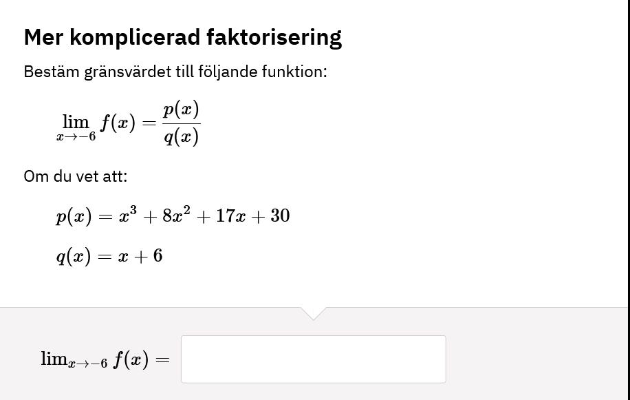 Skulle behöva hjälp med denna uppgiften. Min tanke var att jag skulle vilja bryta ut x + 6 ur täljaren på något sätt för att kunna stryka det både i täljaren och nämnaren, men det ser inte ut att fungera. En annan tanke är att ersätta x med -5,99 , men det känns som fel väg att gå. Hur ska man tänka?