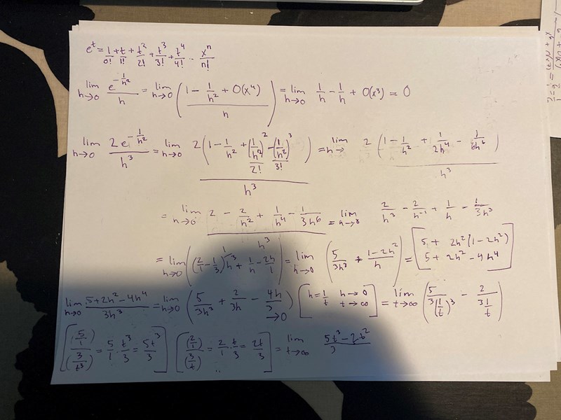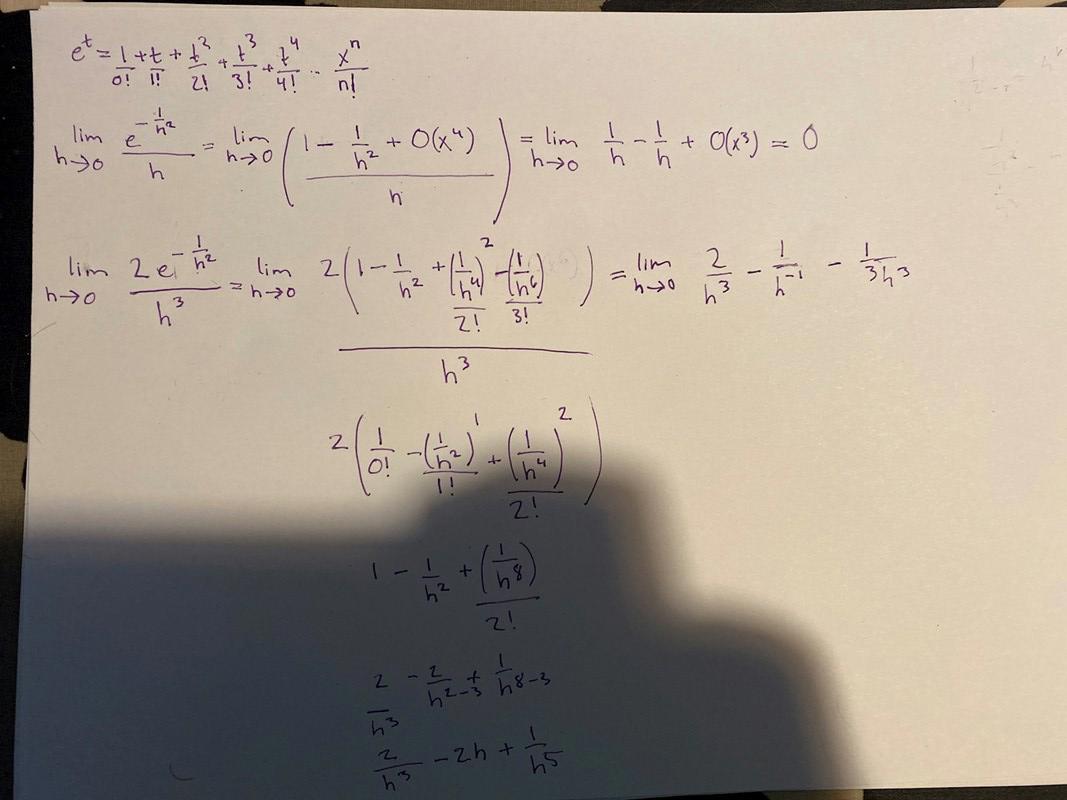 Jag har förstått det som att H'lopitals regel bygger på Taylorutveckling/MacLaurin polynom och därför borde det funka att använda MacLaurin på 2e^(1/h^2) / h^3 eftersom att jag fick det att funka för e^(1/h^2) / h. Eller tänker jag fel?