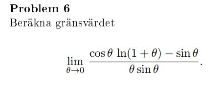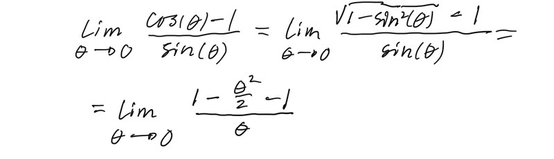 Tror att svaret ska bli (-1/2) enligt photomath. Men jag får att detta gränsvärde går mot 0. Misstänker att limcos(x)-1sin(x)\lim \frac{\cos(x)-1}{\sin(x)} är fel