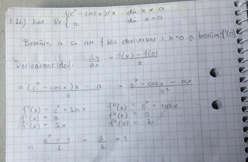 Låt och bestäm a så att f blir deriverbar i x=0 och bestäm