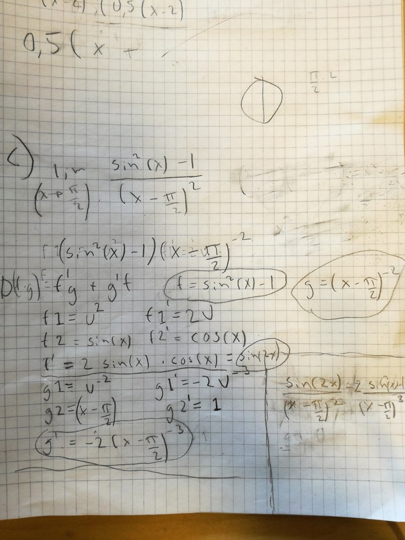 Jag hade glömt bort att man inte ska tillämpa kvotregeln i det här fallet. (L'Hôpitals regel) Okej använde t = x - pi/2. Rätt svar enligt facit ska vara -1. Hur ska där jag har kommit på min lösning? Ska man bara bryta ut konstanterna eller? Då får man ju -1 i alla fall...