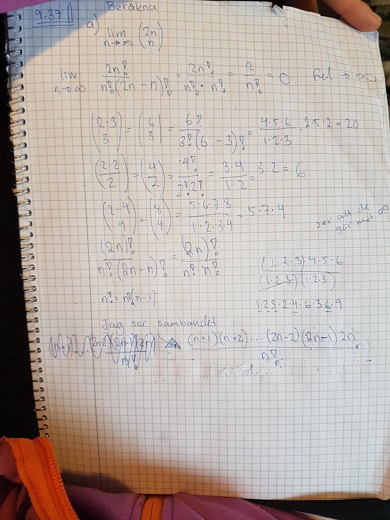 Jo jag såg också att jag gjort fel med 2n! som skulle vara (2n)! Vilket jag ändrat i slutet på texten. De som borde gå att säga är (2n)!/(n!)^2, men jag ser inte hur det hjälper. Sätter jag in tal istället för n blir de tydligt att de går mot oändligheten, men jag skulle vilja beräkna de, inte bara inse det. Jag ser sambandet att det går att dividera bort n! Från täljaren vilket gör att halva senare delen av talföljden finns kvar i täljaren medan n! Finns i nämnaren och är således betydligt mindre än täljaren för stora värden på n. Tex n=6 -> 6!/3!3!=4×5×6/(1×2×3), men hur beskriver jag det matematiskt? ...(2n-2)(2n-1)2n/n! ? Jag vill fatta hur jag skriver (har dyslexi så just att förstå frågorna och skriva själv är inte min starka sida), men i detta fallet vet jag inte ens hur jag ska gå tillväga på ett bra sätt även om jag förstår hur resultatet uppkommer.