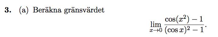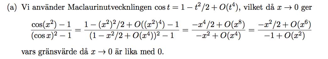 Jag förstår inte hur man i nämnaren får . Jag förstår hur man gör med Maclaurinutveckling och att man ersätter och kvadrerar uttrycket, men jag har försökt att beräkna det som står i nämnaren, men ska man strunta i att räkna med resttermen, så man beräknar bara ??