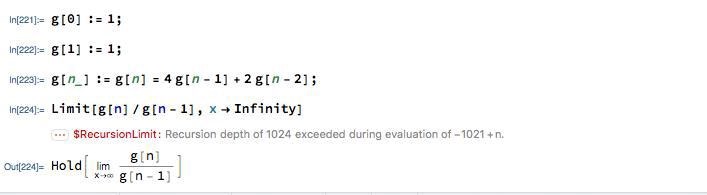 Jag har försökt att beräkna detta mha kommandot Limit men får endast upp ett felmeddelande, se nedan, och det blir samma sak varje gång som jag gör om det. Jag har testat att beräkna ett gränsvärde utan en rekursion och det fungerar utmärkt. Har det med mina benämningar att göra?
