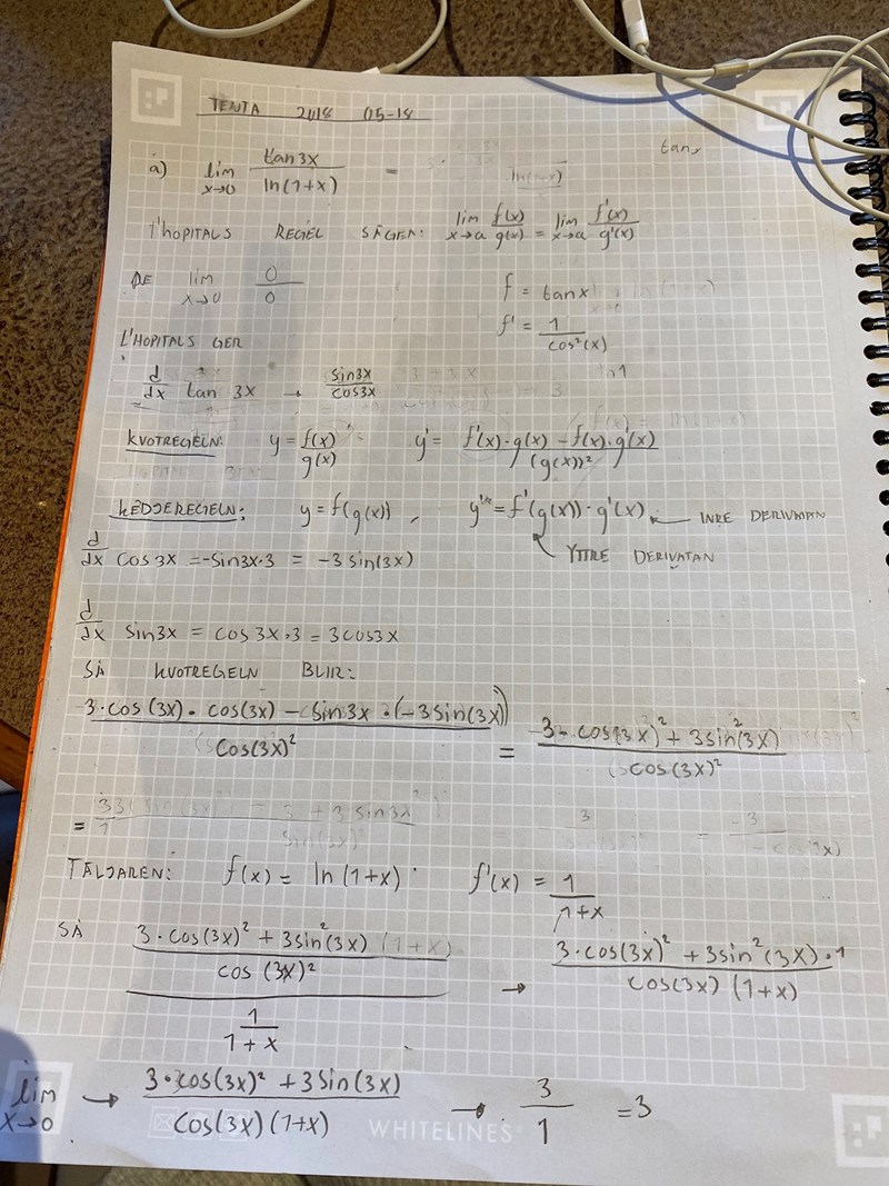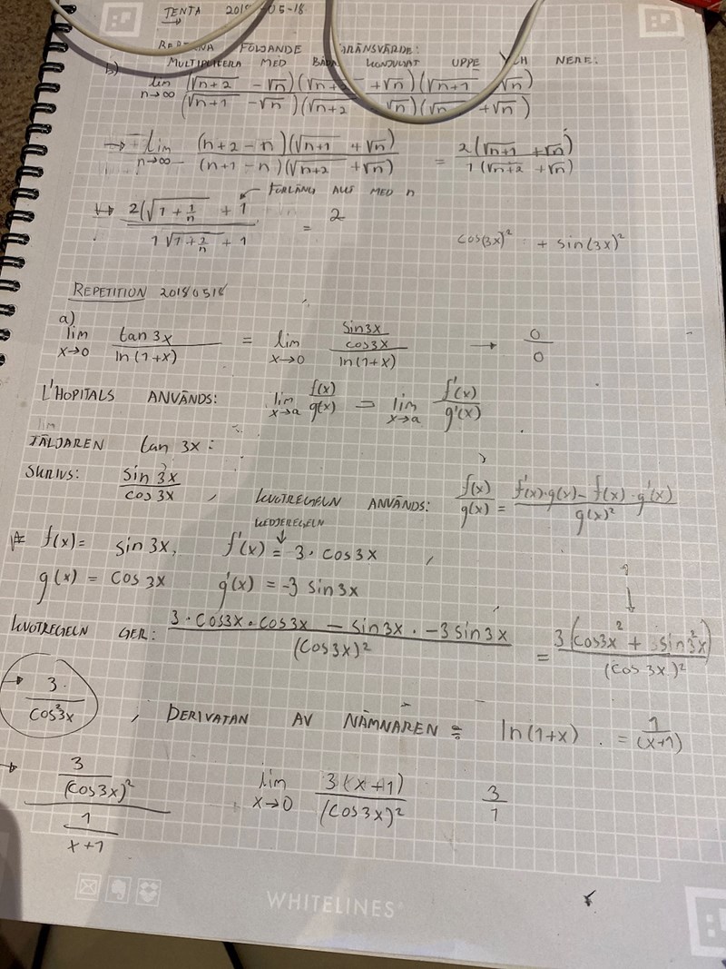 ska hitta gränsvärdet till tan(3x)/ln(x+1). Eftersom det blir 0/0 så antar jag att jag ska utveckla med l’hopitals. EDIT: tog bort min lösning pga råkade skriva tan som cos/sin och skäms ihjäl