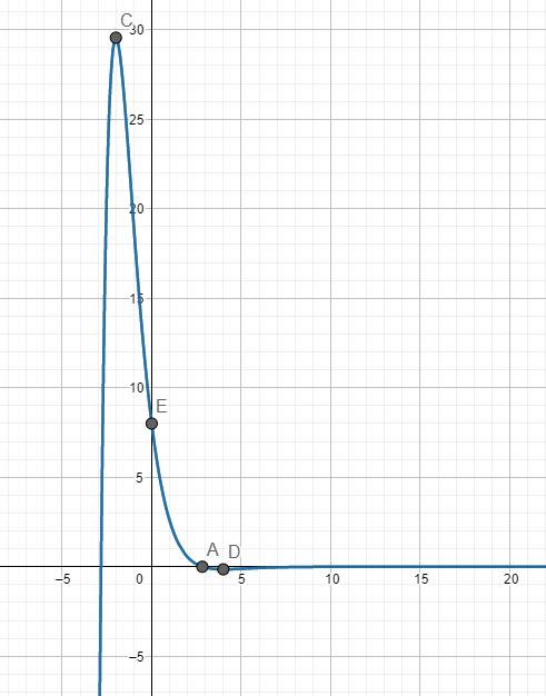 så det finns alltså ett maximum där x=-2 och y=4/e^-2 som också är största värdet. Hur kan man motivera det? kan man göra det genom att skissa grafen. Och sen finns ett minimum då x=4 och y=-8/e^4. Angående att funktionen inte har ett minsta värde. Kan man också motivera det med en skiss och säga att f(X) inte har ett minsta värde då den bli obegränsat negativ när x<0?