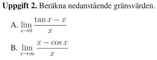 Uppgift A nedan löste jag genom att skriva om uttrycket och använda standardvärdet för , men jag hittar inget motsvarande för cos x i B. Hur är det meningen att man ska tänka här? Det går att skriva om uttrycket till (om man får göra så), men hjälper det?