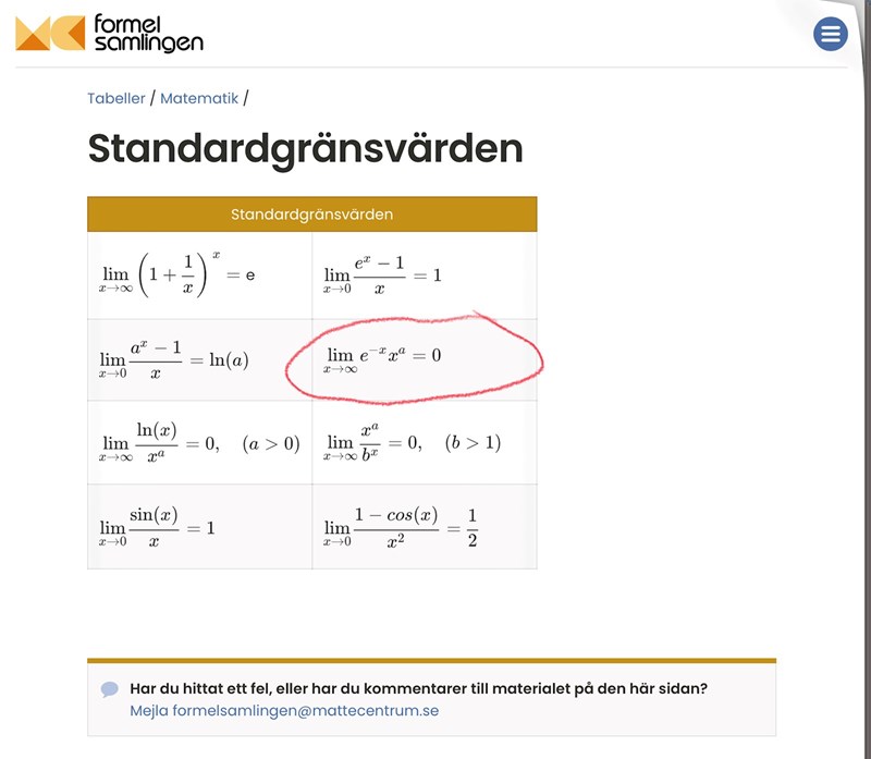 Men jag läste att potensfunktioner växer snabbare än logaritmfunktioner? För visst är e^-x en log-funktion? Och även om e^-x skulle växa snabbare så skulle väl det inte innebära att att gränsvärdet går mot 0? För det är nämligen vad svaret ska bli..! Tack för hjälpen!