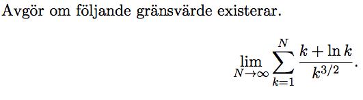 Jag har en liten allmän fråga om uppgifter likt ovan. Först och främst, är det så att man säger att gränsvärden inte existerar om gränsvärdet är oändligheten? För i uppgiften så är det tänkt att man ska undersöka om serien är konvergent eller divergent, och så får man fram att den är divergent och därmed att gränsvärdet inte existerar. Men jag tänker att om gränsvärdet är oändligheten vilket det kan vara om den är divergent, så existerar ju gränsvärdet?? Eller har jag missuppfattat fel, så när gränsvärdet är oändligheten tänker man egentligen att det inte existerar??