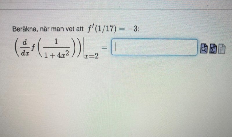 Kedjeregeln, derivatan av f blir f' gånger inre derivatan.