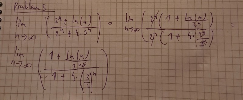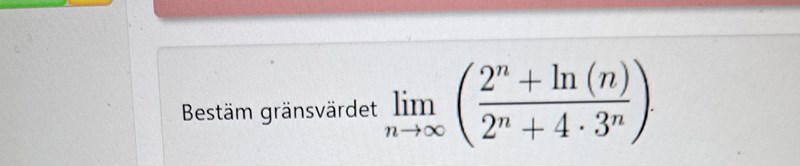 tjena! Jag har problem att avgöra vad täljaren går mot pga ln(n) och 2^n. Nämnaren förstår jag att det kommer gå infinity då (3/2)^n blir väldigt stort.
