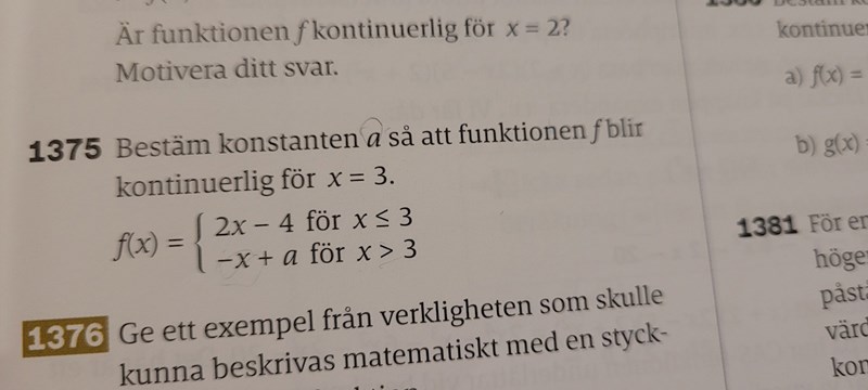 kommer ha ett hopp vid x=3 om a inte är det rätta värdet. Vi kan se det som att gränsvärdet när måste vara samma från både den vänstra och högra sidan om x=3.
