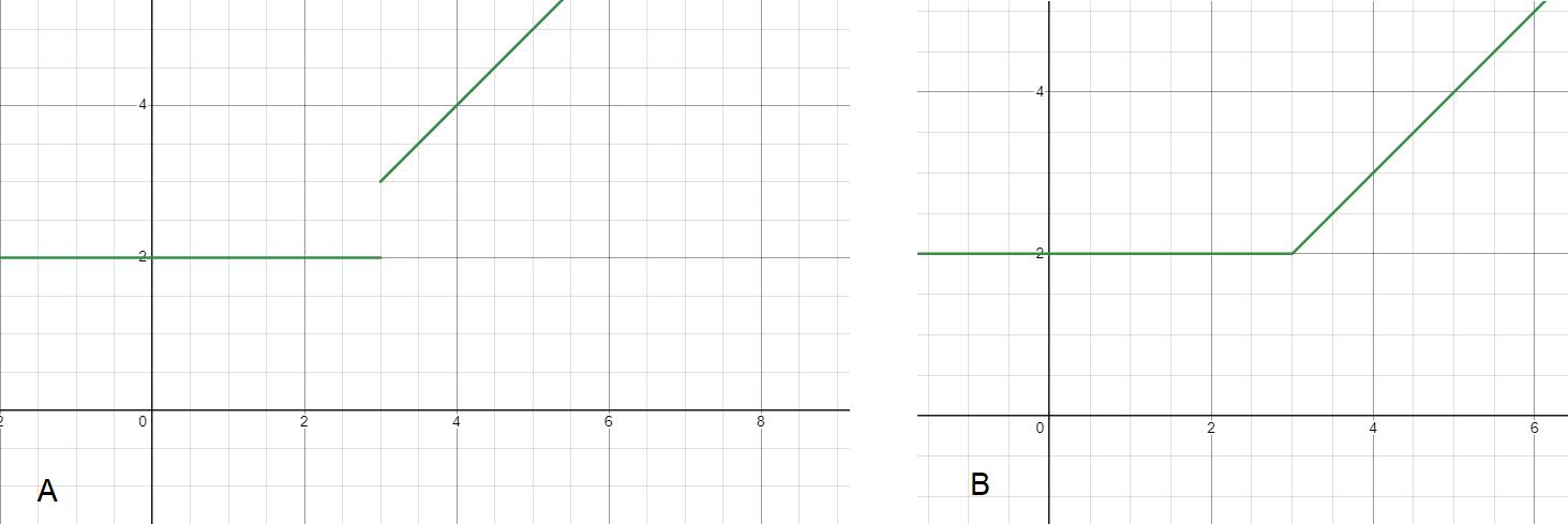 För att en funktion ska vara kontinuerlig kan du tänka att du ska kunna rita ut funktionen på papper utan att lyfta pennan från pappret. Exempelvis är A inte kontinuerlig, men B är det.