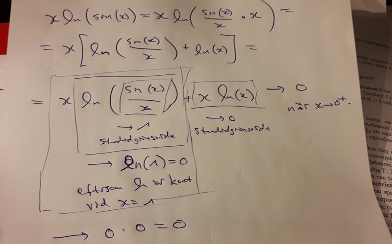 Steg 2 (formellt argument). Låt oss nu sy ihop detta till ett formellt argument! För att göra det brukar det vara enklast att använda någon kombination om standardgränsvärden, variabelbyten och kontinuitet. Utifrån vad vi kom fram till i steg 1 känns det mest naturligt att utnyttja x*ln(x)->0 när x->0+ och sin(x)/x->1. Låt oss därför börja med att tycka in ett "delat på x" i vår funktion. Resten följer sedan närmast automatiskt efter lite förenklaringaar (bl.a. med hjälp av en logaritmlag), precis Albiki visar i sitt inlägg.