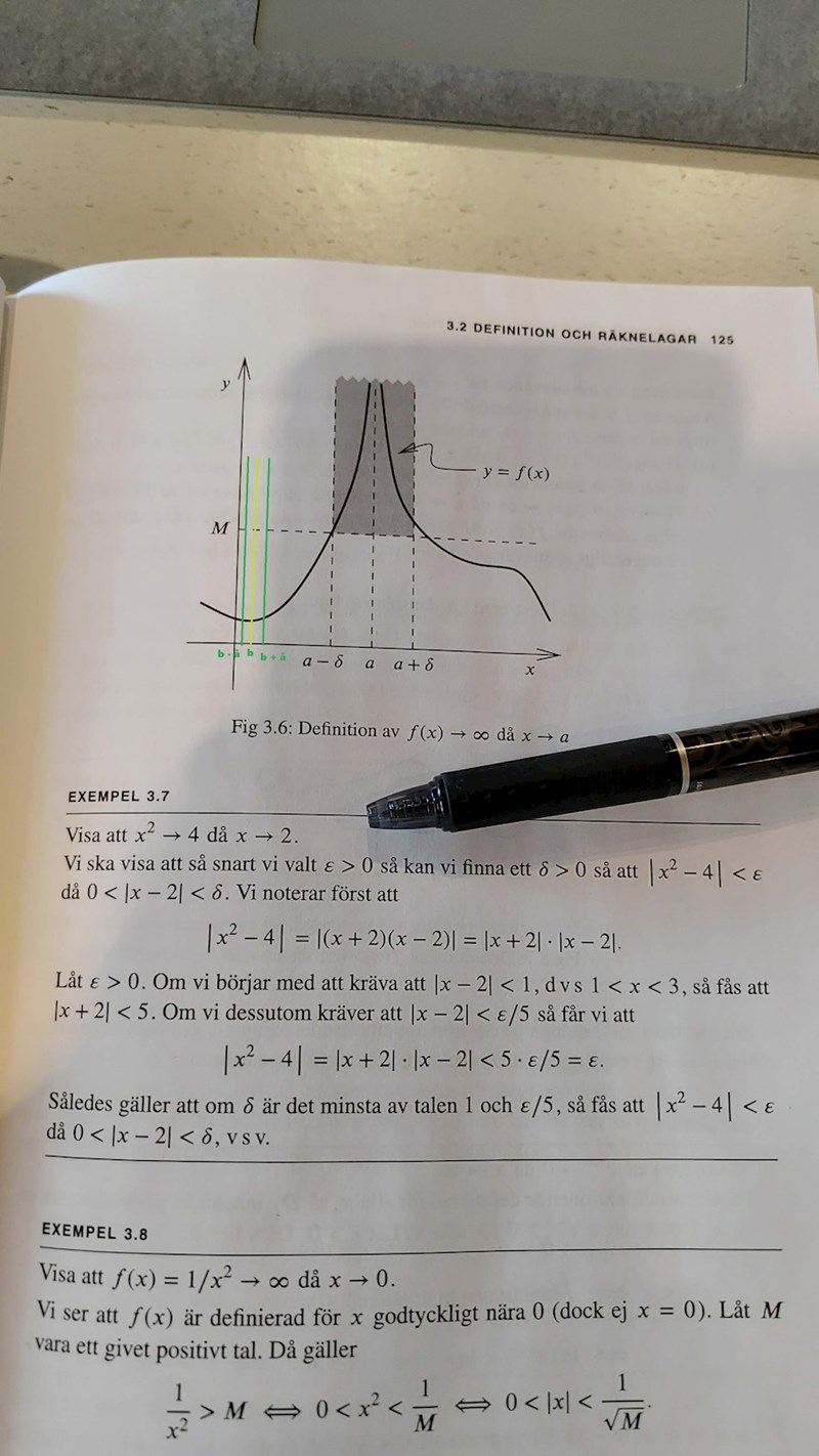 Jag förstår mig inte på den här metoden med att man väljer delta och epsilon. Om vi tar min ritning till vänster i grafen och väljer dessa å (= delta) så borde resultatet vara att vi har visat att funktionen går mot -∞ i b? då b-å är negativ och b+å är positiv?