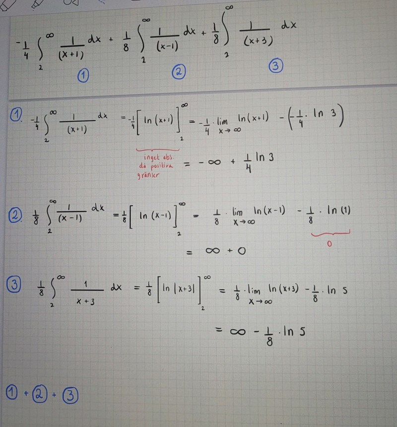 Men det känns skumt att uppgiften är summan av tre divergenta integraler?