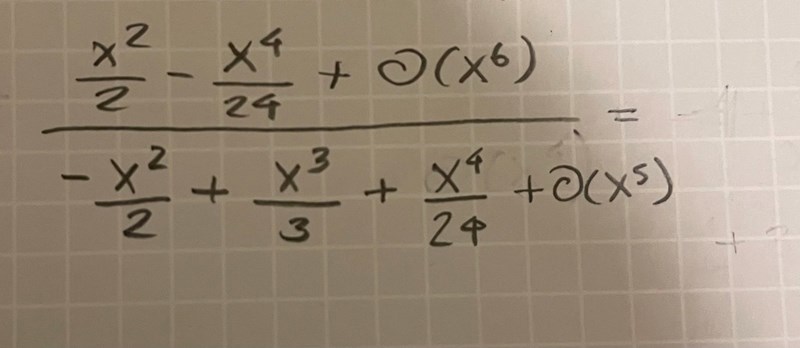 Notera att de konstiga o:en i slutet är ”stora ordo” vilka går mot noll då x går mot noll. Om jag nu låter x gå mot noll, kan jag göra så att jag säger att x^3/3 går mot noll, och sen säger att (x^2/2 - x^4/24)/(-x^2/2+x^4/24) går mot -1, och att hela bråket därför går mot -1? Kan jag alltså välja att gå i gräns på det här sättet, att jag går i gräns bitvis? Det känns intuitivt inte tillåtet men samtidigt är ju gränsvärdet faktiskt lika med -1.