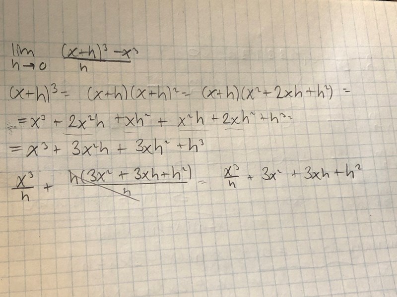 Svaret är ju 3x^2 vilket jag ”nästan” har. Om h går mot 0, så gör ju även 3xh och h^2 det. Men vad händer med x^3/h? Borde det inte gå mot oändligheten?
