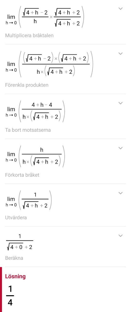 Om hh är mycket nära noll så är 4+h\sqrt{4+h} ungefär lika med 4=2\sqrt{4} = 2, så täljaren är ungefär lika med 2-2=02-2 = 0 vilket gör att kvoten blir obestämd. En annan metod behövs för att bestämma detta gränsvärde; ett förslag är att förlänga kvoten med täljarens konjugatuttryck 4+h+2\sqrt{4+h}+2 och tillämpa Konjugatregeln.