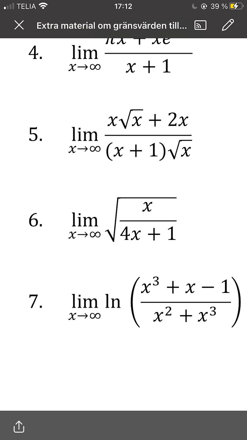 Men om jag ska applicera det på uppgift 6 nedan, hur gör jag då? För i facit står det att en ledtråd är att bråket går mot 1/4, har det något med limes att göra?