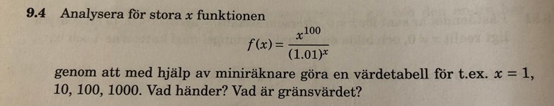 Jag kan också skriva f(x) = x^100 • (1/1.01)^x och man ser då tydligt att den andra termen kommer närma sig noll för stora x, vilket i sin tur innebär att hela funktionen kommer göra det.
