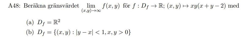 Jag vet hur man hanterar "fria" gränsvärden i flera variabler och har i deluppgift 'a' kommit fram till att gränsvärdet inte existerar (eftersom att och ger olika svar), men hur gör jag om jag har en begränsad definitionsmängd som i deluppgift 'b'? Tror aldrig jag har stött på en sådan uppgift förut. Löser man det på vanligt vis (genom att t.ex. byta till polära koordinater etc.) eller på något helt annat sätt? Tips? Hittar ingenting i min mattebok om detta.