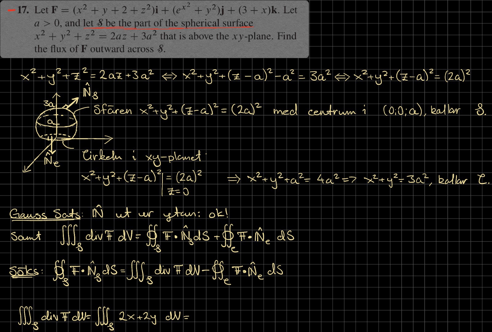 Tror man kan flytta ner sfären så den får centrum i origio, vilket hade gjort livet lättare, kommer dock inte på hur man gör detta. Sen måste väl även x och y i integranden få annorlunda värden pga. cirkeln ej är centrerad.