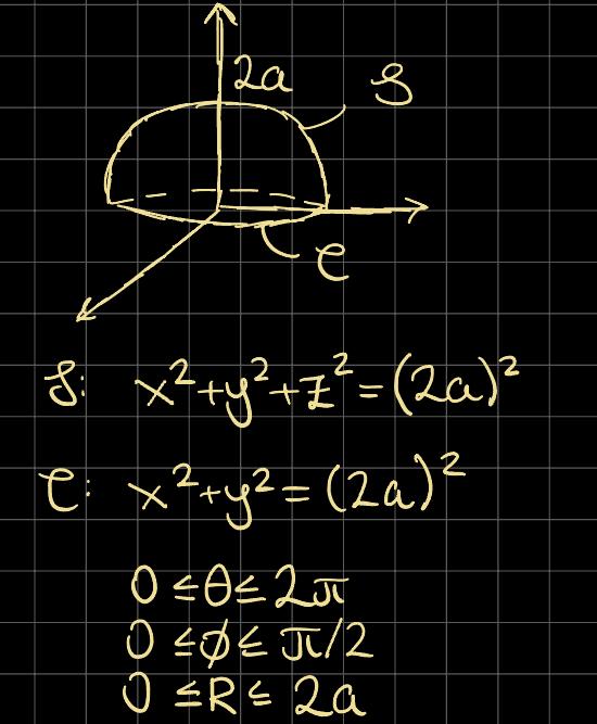 Till uppgiften nedan har jag fastnat på trippelintegralen, kommer inte på vad gränsvärdena ska vara när vi omvandlar till sfäriska koordinater, specifikt R. R bör bero på ϕ\phi och ha störst värde, 3a, då vinkeln till ϕ\phi är 0 och minst värde, 3a\sqrt{3}a, då ϕ\phi är π/2\pi /2.