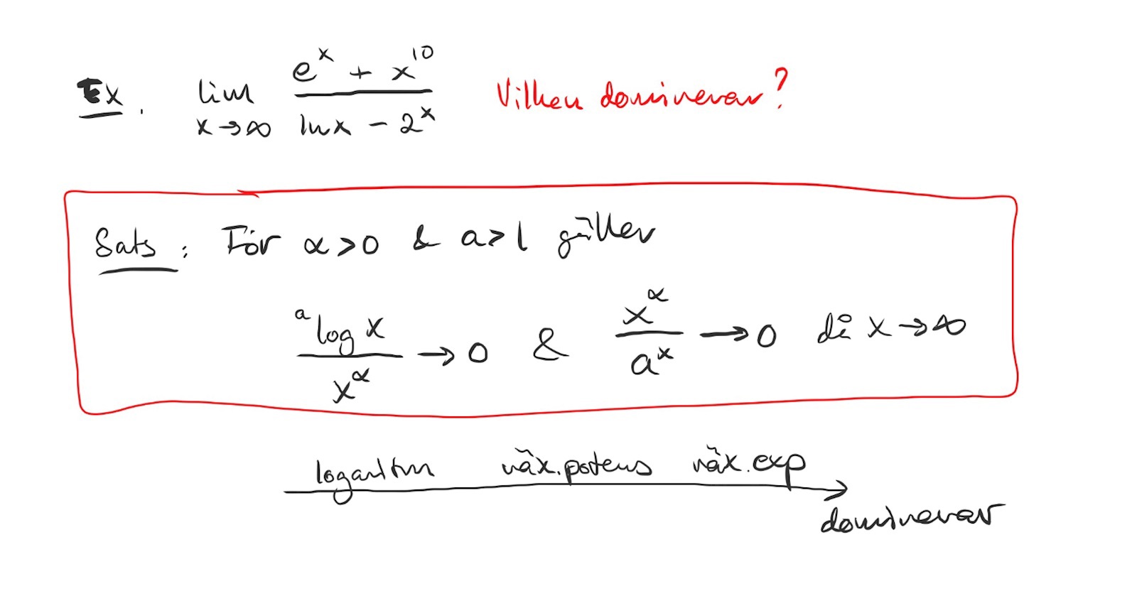 Min lärare gick vidare genom att bryta ut e^x täljaren och 2^x i nämnare. Men enligt satsen så dominerar en växande exponent mer än en potens? eller har jag missförstått?