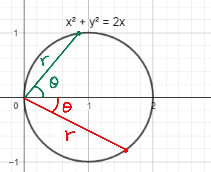 Då cirkeln befinner sig i högra halvplanet så kommer theta (med den vanliga definitionen) att anta värden mellan t.ex -pi/2 och pi/2.
