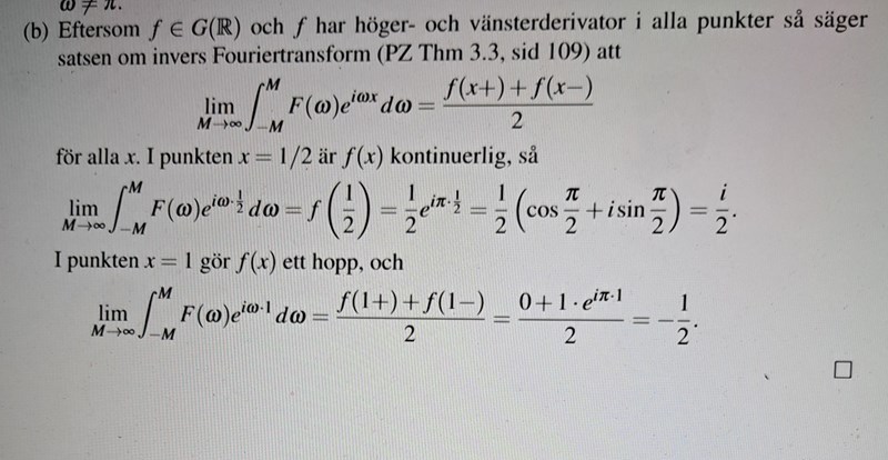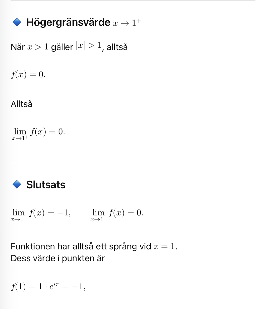 Hur vet man att f inte är kontinuerlig i x=1? Jag tittade på f(x+)+f(x-)/2 och den blir 0. Men när vi tittar på f(x+) då x närmar sig 1 från positiv sida så får vi 1e^pi=cospi+isinpi=-1 . Men när x närmar sig 1 från minus sida så får jag samma svar som för f(+x)