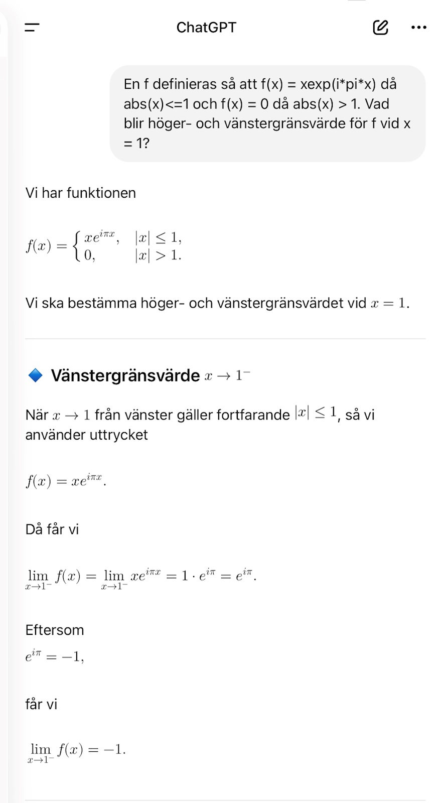 PATENTERAMERA skrev:Båda gränsvärdena existerar. GPT använder samma funktion som i problemtexten och beräknar båda gränsvärdena. De blir dock olika.