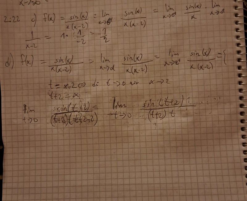 Mm precis. Eller asså vi får inget skillnad t=x så vi får bara sin(t)/t och sen 1/t-2..Men vi kan se att ena uttryck blir 0 då det närmar sig 2 från positiva sida.