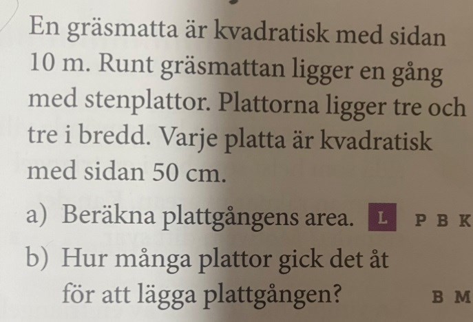 Hej! Jag behöver hjälp med denna uppgift. Jag vet att man ska tänka att gräsmattan och platt gången runt om bildar en kvadrat. Men jag vet inte hur jag ska räkna ut.