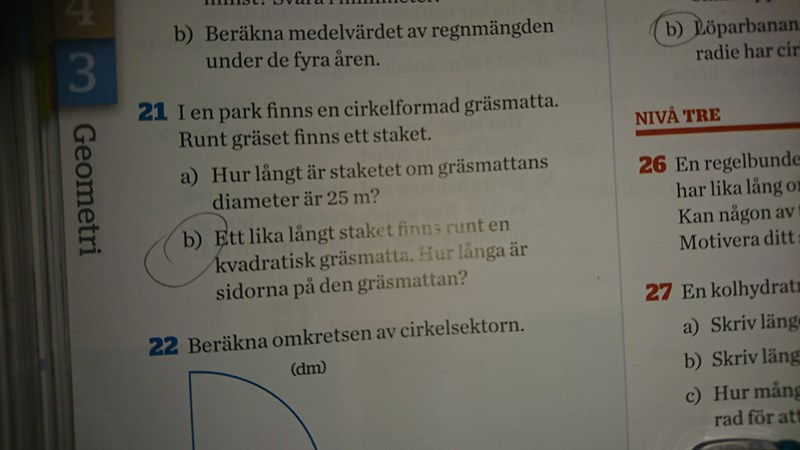 det är ju fel. Omkretsen på den kvadratiska gräsmatta består av fyra sidor så 78,54 ska delas med 4.