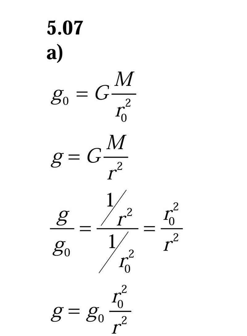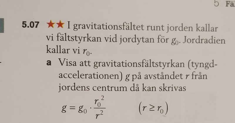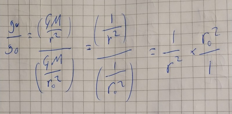 De som har gjort facit kunde gott ha satt dit en rad till ovanför den med g/g0 där man kan se GM i både täljare och nämnare, innan man förkortar bort dem. Sedan har man förlängt kvoten med (r0)2 för att slippa dubbelbråket.