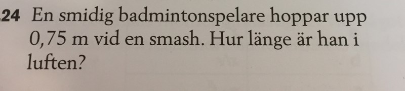 Njaa asså jag vet inte om vi förstår varandra nu. Tänk dig i vektorer istället, den vektorn som drar dig neråt. om du ska kunna ta dig uppåt så måste vektorn som för dig uppåt vara längre än den undre, arnars blir den resulterande kraften 0. Därför så tror jag att när man ska räkna ut tiden för hoppet så ska man använda ett högre värde än 9,82. men ”vektorerna” kanske är väldigt lika kraftmässigt eftersom han bara kommer upp 0,75m och därför är de rätt så lika och det går därmed bra att använda 9,82 båda gångerna.