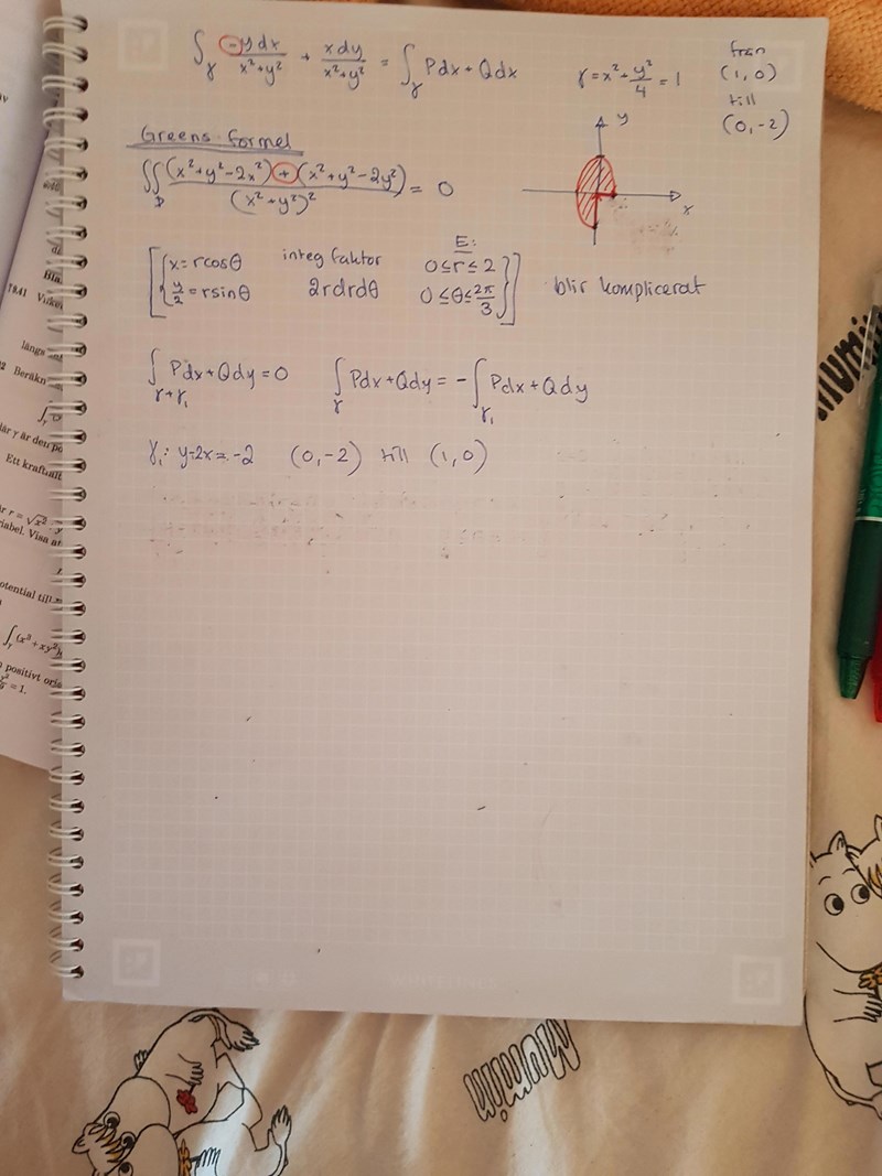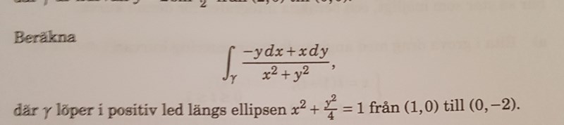 Jag fattar inte hur jag ska tänka. Med greens formel får jag att integralen blir 0, bra! För att greens formel ska gälla måste cirkeln vara sluten vilket gör att den delen som ska beräknas borde vara lika med antingen integralen då x=0 och y=t då t varierar mellan -2 och 0 samt men dx=0 kommer det bli 0 presis som den andra delen då y=0 och x varierar med tiden. Jag provade använda vägen y=2x-2, men fick då en knepig ekv i nämnaren (5x^2-8x+4). Har jag missuppfattat hur man ska använda greens formel? Jag skulle vilja ändra till polära koordinater, (x=rcost, y=rsint) vilket skulle ge en väldigt enkel ekv då integralen blir över 1, men då borde ju det jag ska integrera över bli komplicerat, kanske är de här det blir snurrigt för mig.