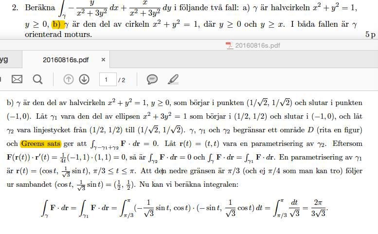 Du vill egentligen bara ha fram integralen längs 1/8 av enhetscirkeln, den delen som ligger i första kvadranten närmast y-axeln. Den integralen du har är fruktansvärd att beräkna, så du gör (nästan) vad som helst för att hitta något som är lättare. Eftersom nämnarna i integralen ser ut som de gör, skulle det vara mycket lättare att beräkna integralen för en kurva där nämnaren har samma värde hela tiden - det finns en sådan kurva, och det är ellipsen x2+3y2=kx^2+3y^2=k. Om man väljer värdet på kk smart, så kan man få en ellips som har en ändpunkt gemensam med cirkelbågen och där den andra ändpunkten ligger så att det inte blir alltför krånglig att integrera längs en rät linje från ellipsens andra ände till cirkelns andra ände.