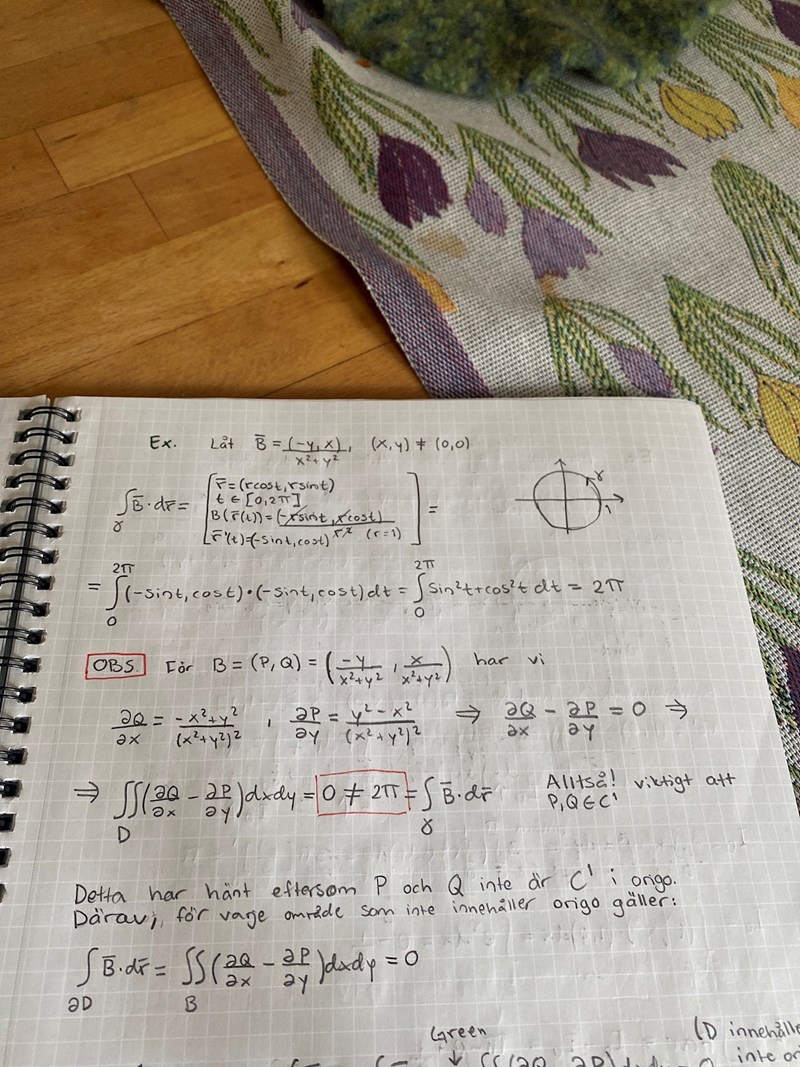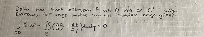 PATENTERAMERA skrev:Precis. Det är viktigt att P och Q är C1 i hela det område som man integrerar över för att greens formel skall gälla. Här var funktionerna inte C1 i origo, så om området innefattar origo så kan man inte tillämpa greens formel. Men i ett område som inte innefattar origo så funkar greens formel.