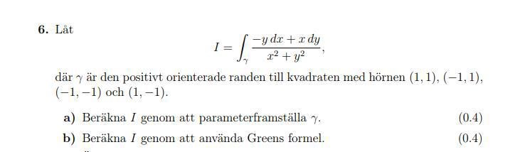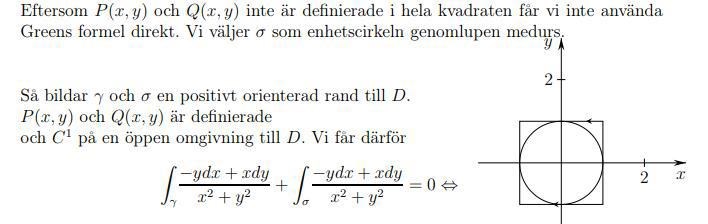 Eftersom utanför bör en tillämpning av Greens formel (Stokes sats) medföra förenklade beräkningar. Men då måste man ombesörja att integrationen sker över ytor som inte skärs av z-axeln (inte innehåller den singulära punkten). Det är därför man i facit väljer att lägga en yta som begränsas av dels kvadraten, dels cirkeln. Cirkelns uppgift är att utestänga singulariteten från integrationen. Du kan välja en cirkel med vilken radie som helst, förutsatt att du håller dig inom kvadraten och samtidigt som du håller singulariteten ute.