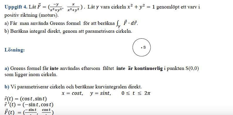 Om fältet är kontinuerligt överallt på vet vi att svaret blir noll, men uppgiftsmakarna brukar gilla att jävlas litegrann och slänga in en diskontinuitet. Då får vi ofta lägga till en kurva för att gå runt diskontinuiteten, men vi kan ändå använda Greens sats tillsammans med en parametrisering (som vi gjort här) för att förenkla beräkningarna.